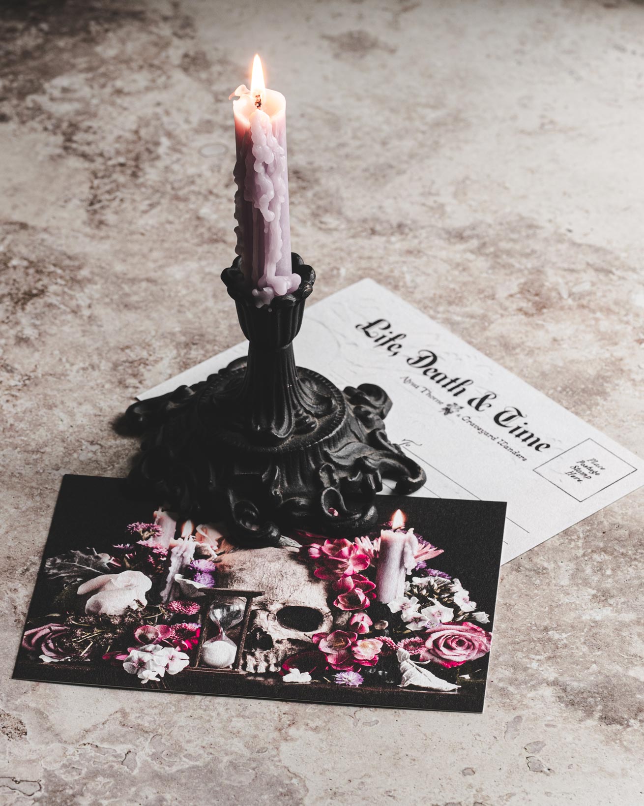 Each set of 3 taper candles are made using our handmade molds & scented with Beloved Bones: reminiscent of a crisp Autumn morning in Salem streets, esoteric boutiques & witches brooms.